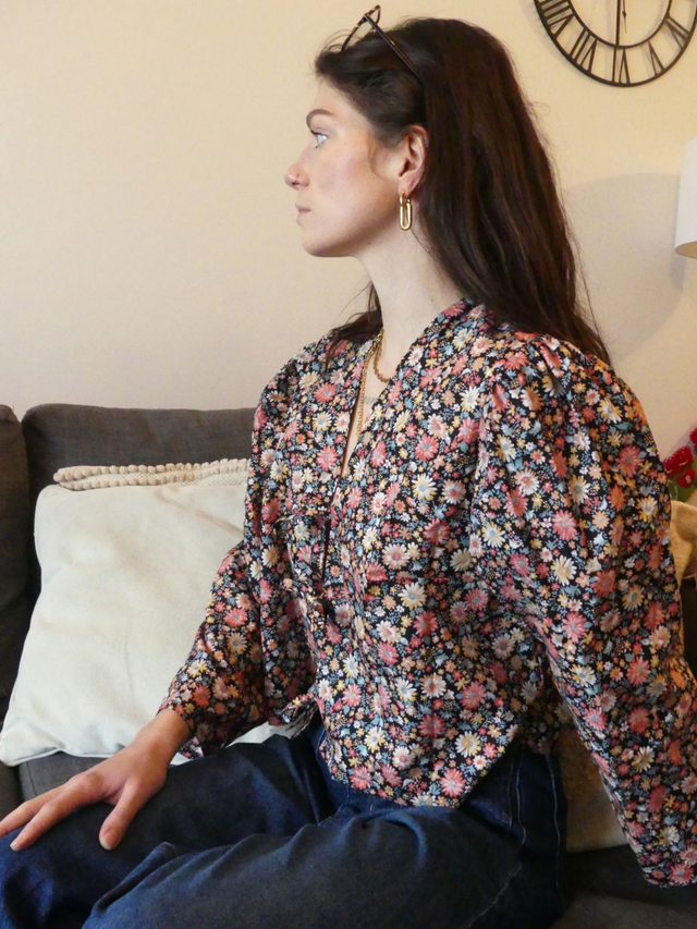Blouse upcyclée réalisée à partir d'un tissu chiné de seconde main.