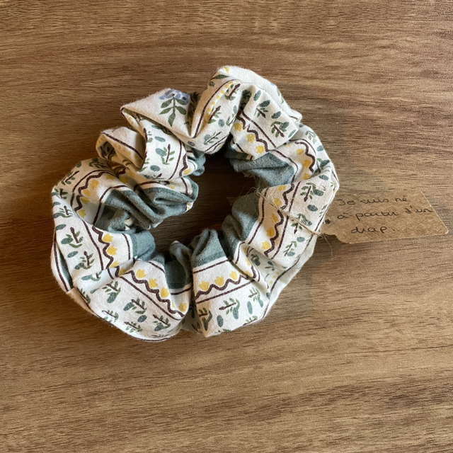 Chouchou upcyclé à partir d’un drap récupéré en ressourcerie.